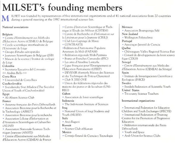 MILSET held its founding meeting during MILSET Expo-Sciences International 1987 in Quebec, Canada.
